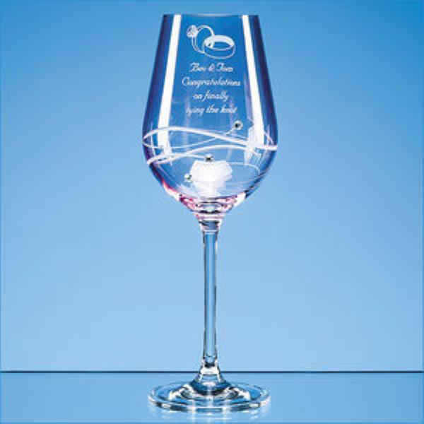 A single, elegant, long stemmed pink tinted wine glass would make the perfect romantic gift or memento of an engagement, wedding, birthday or anniversary. A delicate spiral cut design and three sparkling Swarovski Diamante crystals placed along the swirl add a touch of glamour. And it can be personalised with an engraving of a date, names, inscription or message. To make it extra special, why not order with a beautiful presentation box lined with satin?
