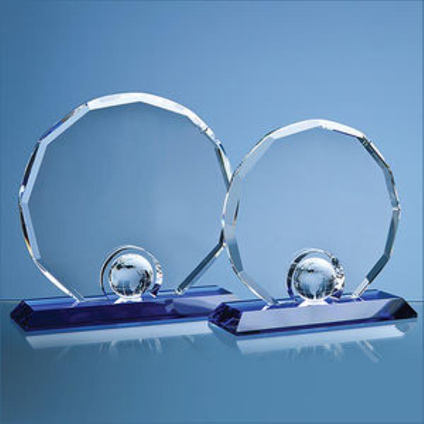 A unique and very stylish award that combines a 17.5cm optic crystal decagon that is mounted on a Sapphire Blue crystal base with a 4cm optic globe mounted on the base. They are available in 3 sizes and make ideal recognition, achievement or incentive gifts for global, travel or transports based companies. They can be personalised with any crest, logo or wording to create an award that is sure to take pride of place when put on display at home or at work. They are supplied in a black foam lined presentation box. Print method offered on the product is Decal(Low Fire Colour Printing), Sandblast Engraving. Also available Colour Infill print method contact us for details.