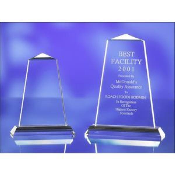 Optical Crystal Glass Award. Size: 228 x 180 x 50mm. Complete with a presentation box. Also available in a larger size. Engraving set up charges apply.