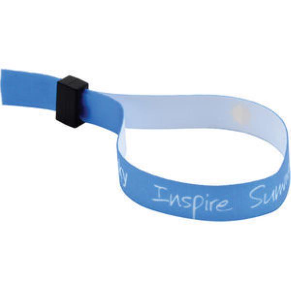Full colour event wristband. Smooth polyester with black plastic 1 way closure. Size: 1.5x36cm.