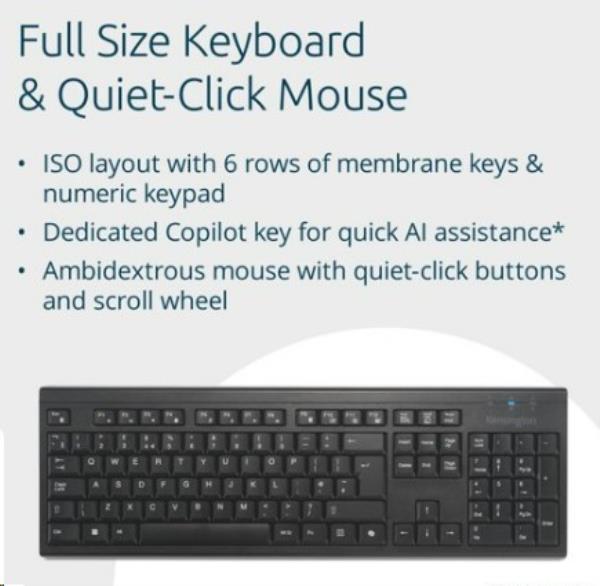 Set includes a wireless Keyboard & Mouse Contains 60% post-consumer recycled (PCR) plastic* 2.4GHz dongle and charging cable Rechargeable 500mAh batteries supports up to 4 months of productivity with a single charge Full size keyboard with dedicated Copilot Key** LED indicators offer visual confirmation for battery life Num Lock Caps Lock Scroll Lock and pairing status Quiet-click ambidextrous mouse