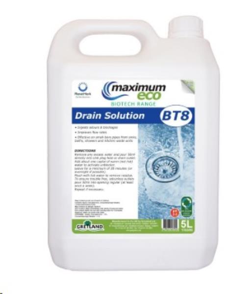 Fragranced biotech drain solution 5Litre Fragranced biotech drain solution that digests odours and blockages, rapidly improving flow rates in small-bore pipes from sinks,urinals, baths, showers, kitchen units and septic systems.