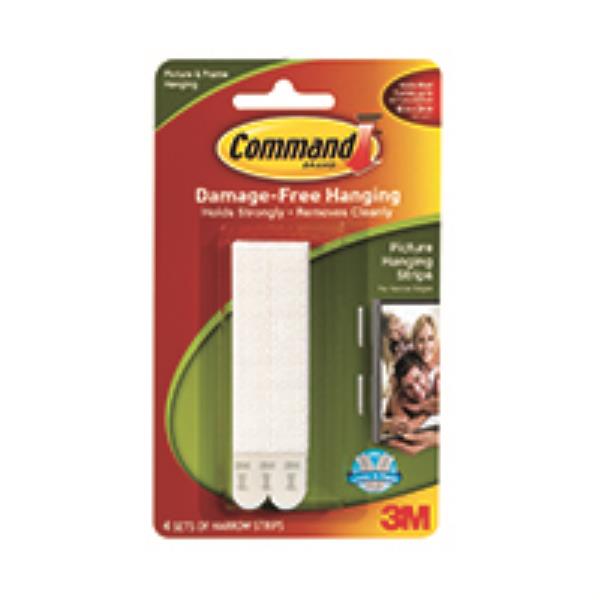 3M Command Narrow Picture Hanging Strips White 17207. Damage free hanging solution. No need for nails or screws. Easy to apply. Hold strongly and remove cleanly. Pack of 4 adhesive strips.