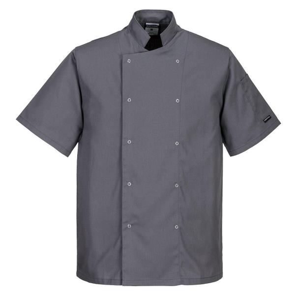This modern and sophisticated jacket will meet the needs of all your team. The lightweight and durable fabric works to keep you cool and will ensure you look your best wash after wash. Features include a mandarin collar, stud front and handy sleeve pocket.