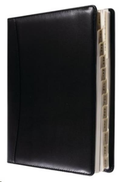 Refillable wirebound diary Week to view with appointments Luxury padded faux leather covers Monthly Mylar tabbing, removable A-Z personal directory and notebook Current and forward year planners and 2 ribbon markers Includes a pen holder and zip-lock section for receipts Colour: Black Dimensions: 190 x 127mm
