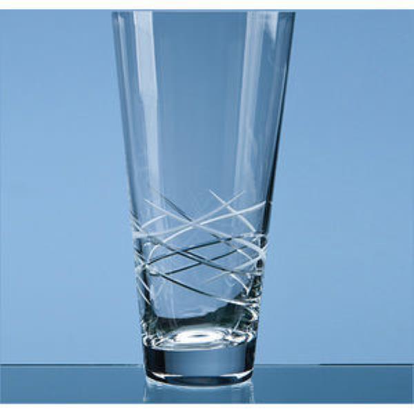 The contemporary style of the 25cm Tiesto conical vase is enhanced with a stylish cut pattern around the base of the vase. There is a large engraving area that can be personalised with any crest logo or wording to create a gift that is sure to be treasured by the recipient. The Tiesto vases are available in 4 sizes making them perfect for 1st 2nd 3rd and 4th place competition prizes. Print method offered on the product is Sandblast Engraving. Also available Colour Infill print method contact us for details.