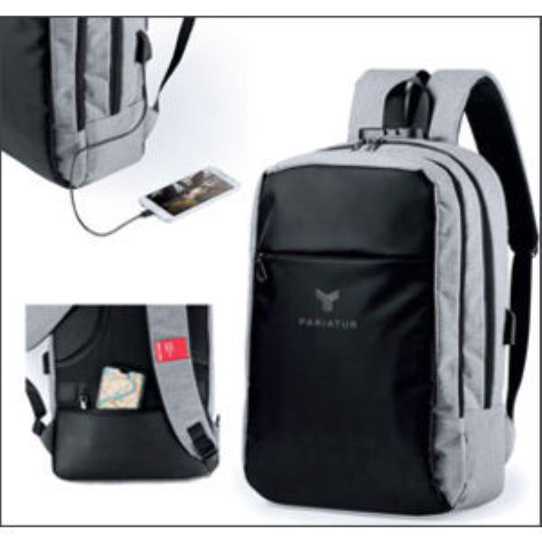 Anti theft, business backpack in high quality 300D. USB charging port powerbank not included and pocket in left strap with an easy access for transport card and other frequently used documents. Security lock with password and 2 main, independent, compartments with zipper closure and a padded pocket for notebooks up to 15 inches size. Wide range of inside and outside pockets, including an anti theft pocket at the back. Shoulder and back straps with ergonomic padding. Including trolley fitting accessory.