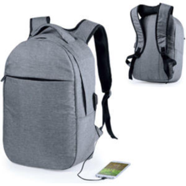Security backpack in an urban design and in resistance 300D polyester material. Inside pocket with RFID (Radio Frequency Identification) security technology that keeps card and other devices data safe. Main compartment with an elegant zipper cover. With USB connection power bank not included and inside, padded pocket for laptops up to 15 inches. Padded backside and shoulder straps.
