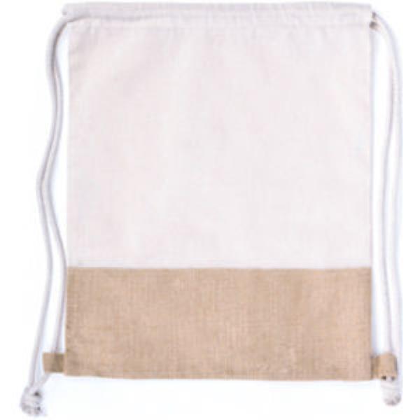 Drawstring backpack in nature line. Base in resistant jute and upper part in cotton 120g/m2. With thick, braided strings and reinforced corners.