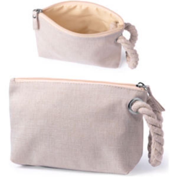 Multipurpose bag in a soft combination of cotton and polyester materials in natural colours. Zipper in matching colour, with a practical weaved string and a reinforcement metal eyelet. Soft inner lining in natural colour.