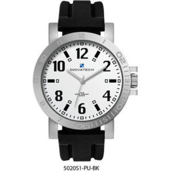Alloy case, matte silver dial with black printed indexes, black silicon rubber strap