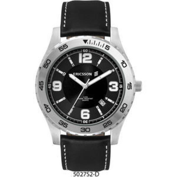 Alloy case, 2-tone black sunray dial with white luminous printed indexes, padded black natural leather strap w/white stitching