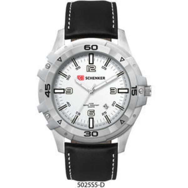 Alloy case, matt silver dial with white luminous printed on black raised ND indexes, padded black natural leather strap w/white stitching