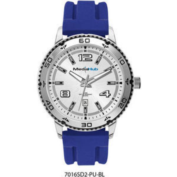 Alloy case, sunray silver dial with silver raised ND indexes, blue silicon rubber strap