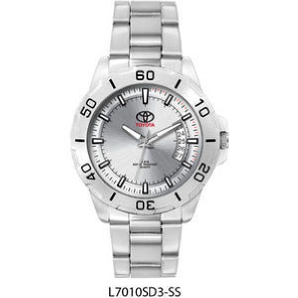 Alloy case, silver sunray dial with white luminous printed on black raised ND indexes, folded S/S band