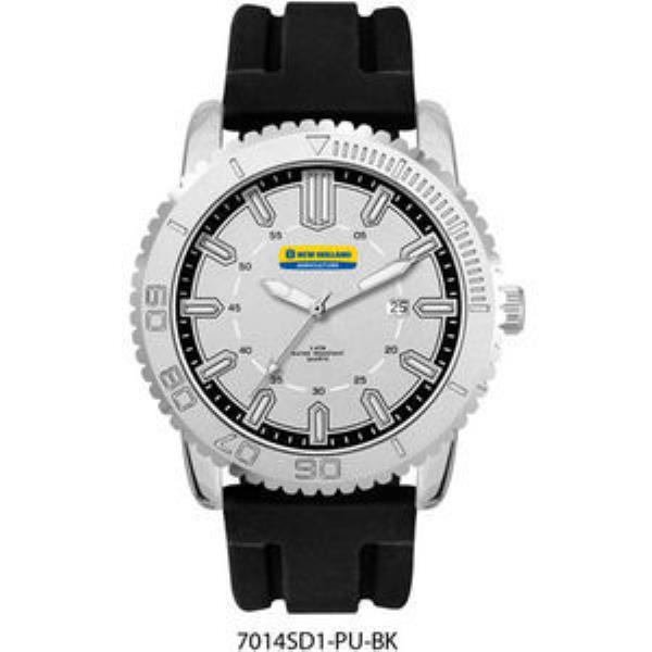 Alloy case, silver sunray dial with white luminous printed on silver raised ND indexes, black silicon rubber strap