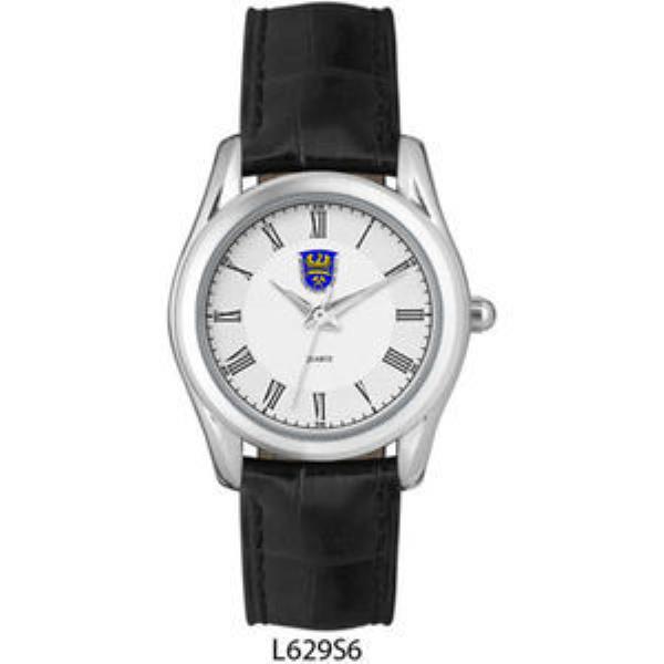 Alloy case, 2-tone silver dial with black printed indexes, padded black crocodile back pattern leather strap