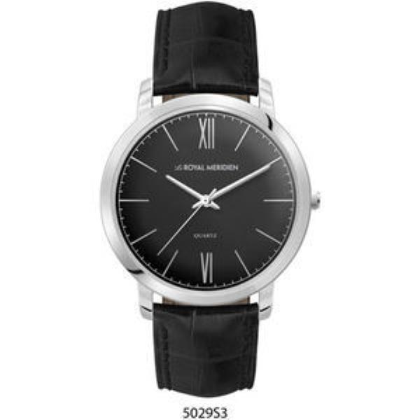 Alloy case, black dial with silver printed indexes, padded black crocodile back pattern leather strap