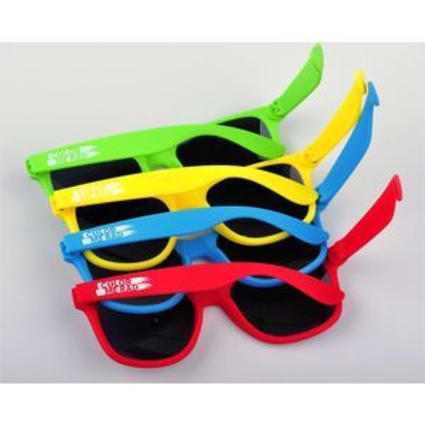 Classic Wayfarer Style Sunglasses with rubberised soft touch frames. Choice of standard or pantone matched frame in retail grade polycarbonate material. Screen printed to both outer arms. Optional extras include mirror lenses.