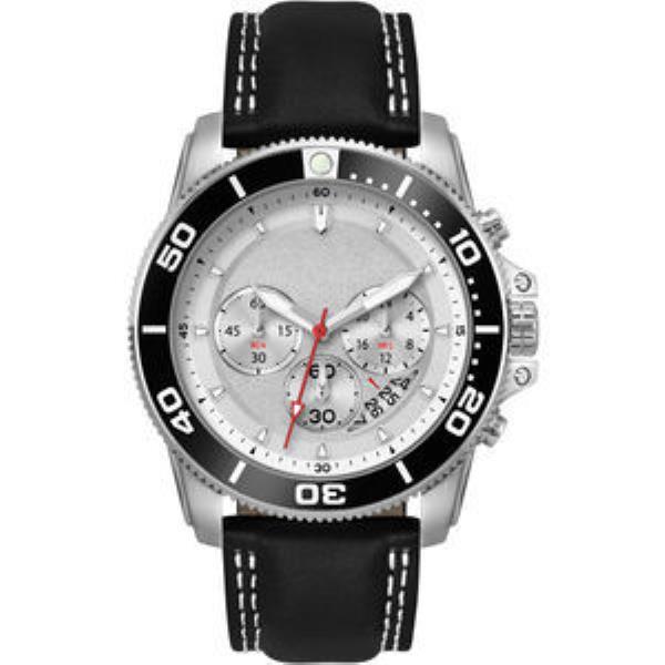 White Luminous Printed on Silver Applied Indexes, Matte Silver Dial. Padded Black Natural Leather Strap w/Double White Stitching.