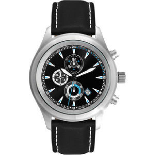 Blue/White Printed Indexes, Glossy Black Dial. Padded Black Natural Leather Strap w/White Stitching.