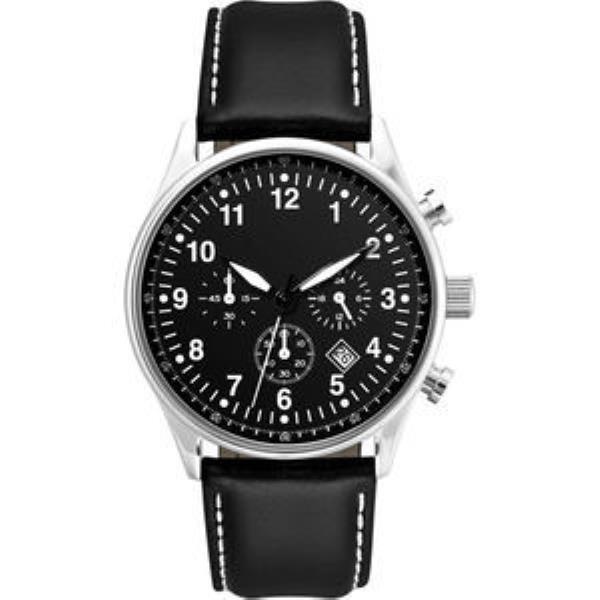 Pilot style chronograph watch with white luminous indexes. dome lens and matt black dial. Padded natural leather strap. Min. order 12.