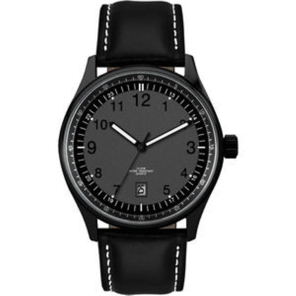 Matte Black Plated Case. White Luminous Printed Indexes, Matte Gray Dial w/Black Rim. Padded Black Natural Leather Strap w/White Stitching.