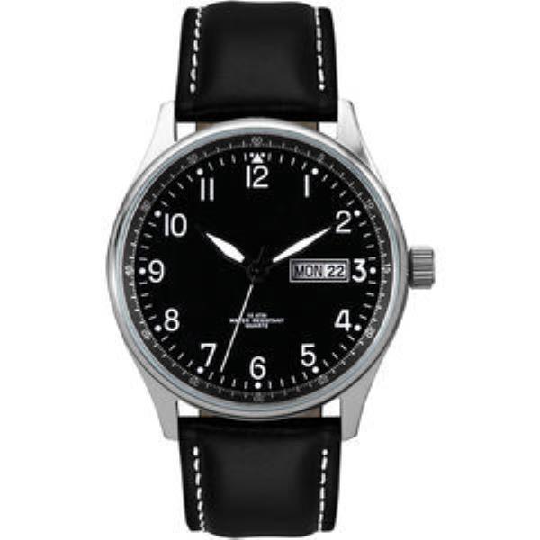 White Luminous Printed Indexes, Matte Black Dial, with Day Date. Padded Black Natural Leather Strap w/White Stitching.