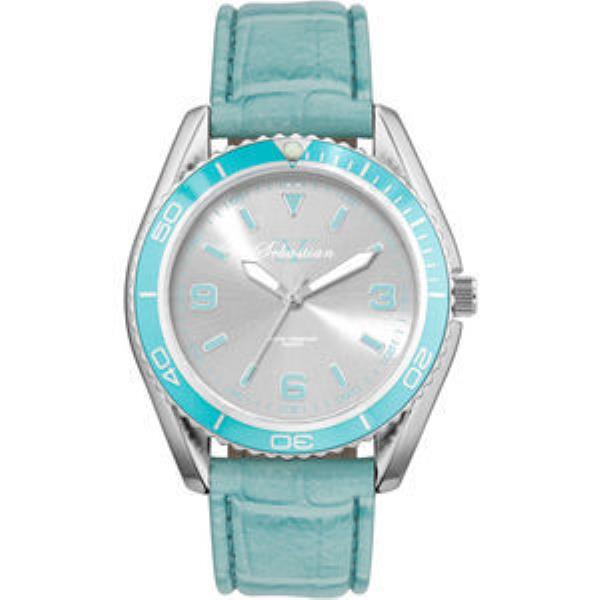 Aqua Color Printed on Silver Embossed Indexes, Silver Sunray Dial, Aqua Padded PU Leatherette w/Croco Back Pattern Strap