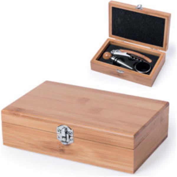 Wine set in bamboo wood. Stainless steel accessories. Includes corkscrew, dispenser and drip collector. Presented in an individual, bamboo wooden case with diecut inside.