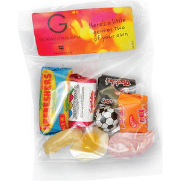 Small clear bag containing a Retro style sweet mix. The bags are personalised with a digital print label.