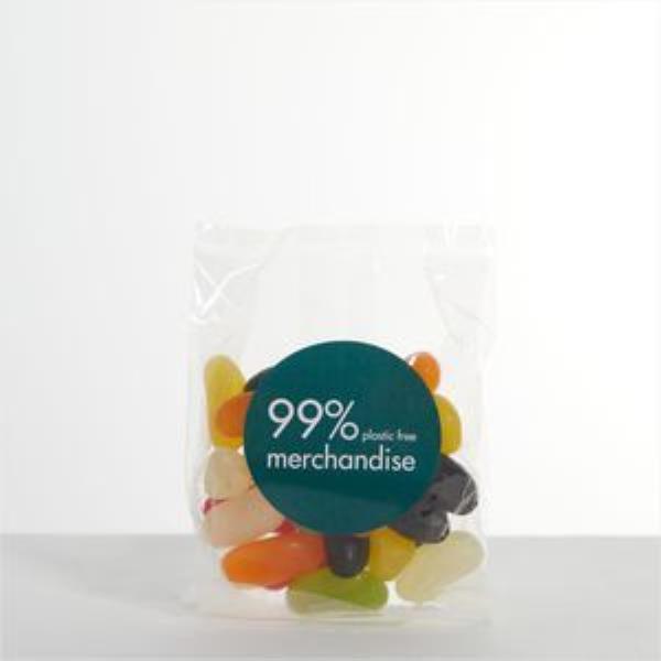 Mouth watering assorted Jelly Beans in branded compostable/dissolvable sugar cane bag. A large 50g fill with full colour digital label to create an ethical and fun giveaway.