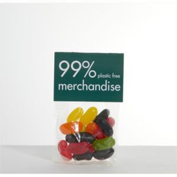 Mouth watering assorted Jelly Beans in branded compostable/dissolvable sugar cane bag. A large 50g fill with full colour digital label to create an ethical and fun giveaway.