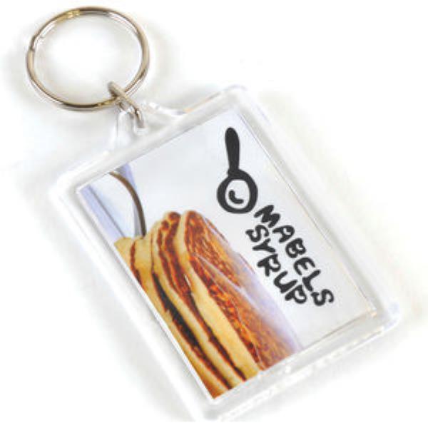 Fully personalised clear keyring up to 35 Dia with full colour paper insert logo on both sides. Includes large split ring.