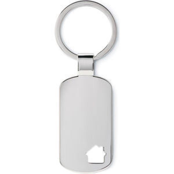 Metal key ring with house detail on the bottom. Individually packed in black box. Material: Metal.