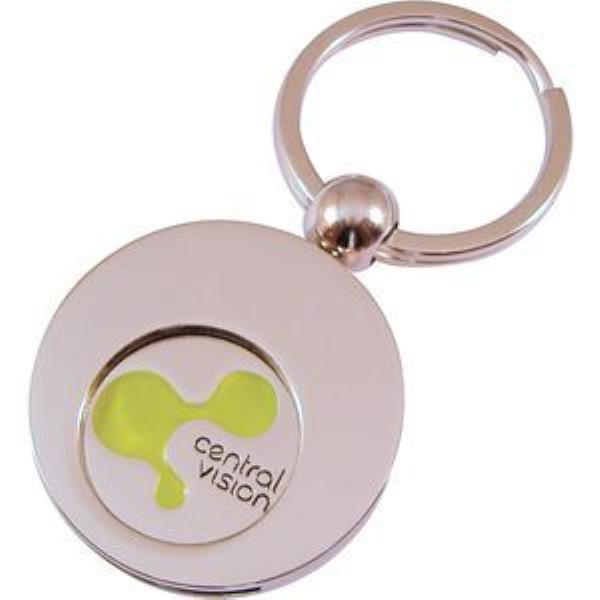 Round trolley or locker coin keyring with sprung-loaded jaws to retain the coin. The coin is die stamped with a soft enamel logo on both sides. Available in Pound or Euro sizes. Nickel or Gold plated (at extra cost).