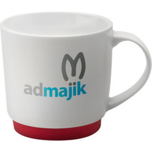 The Paris Mug is a wonderfully versatile mug which can be customised with either a Red, Blue, Green or Black Silicone rubber base. Not only does this add a splash of colour to your Promotional Mug, it also provides extra grip to help keep the mug stable on all surfaces. This is the Transfer print option which is suitable for more complex artwork