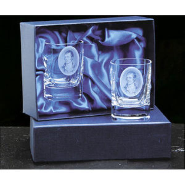 Pair of crystal square tot glasses supplied in a blue Satin lined box. Perfect executive gift.