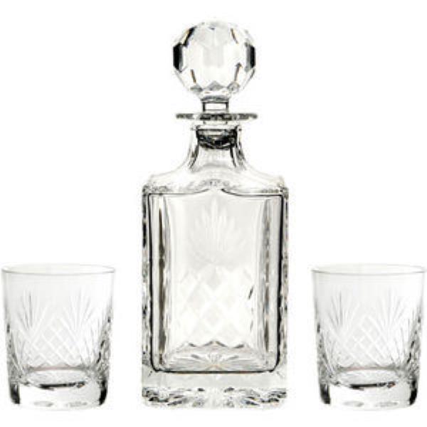A cut square crystal decanter (DCS) and two heavy cut crystal tumblers (DW) supplied in a Satin lined box. Perfect executive gift