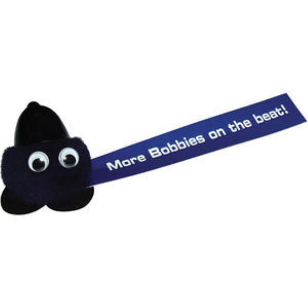 Police Helmet Logobug - with your promotional message printed in Full Colour on Ribbon. Part of our extensive Hatter Logobug Range this Logobug is ideal for a Police or Crime Prevention marketing Campaign. Chose from our large selection of Pom and Feet Colours to suit your branding.