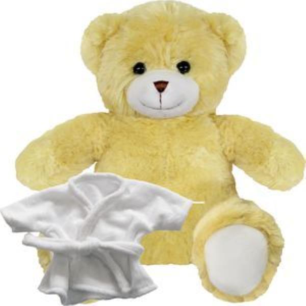 BLANK PLUSH SOFT TOY 20CM ELIZABETH TEDDY BEAR with Dressing Gown. Elizabeth Plush Toy Bear Suitable for Age 3. with Glass Studded Eyes. White Robe with Tie Cord, Sitting Height 20cm Approx. Minimum Quantity: 10.