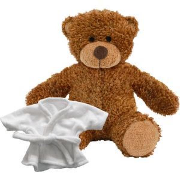 BLANK PLUSH SOFT TOY ANNE TEDDY BEAR with Dressing Gown. Luxury Anne Plush Toy Bear, Suitable for All Ages, Machine Embroidered Facial Features, White Robe with Tie Cord, Seated Height 18cm Approx, Brown Colour Fur, Minimum Quantity: 10.