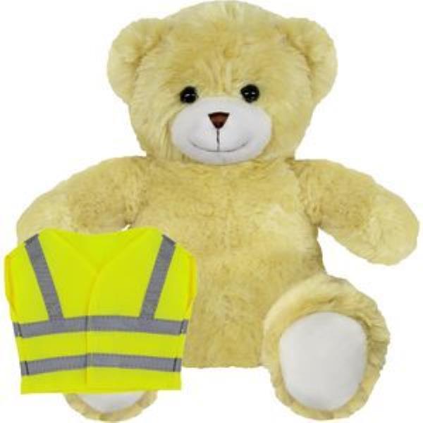 BLANK PLUSH SOFT TOY 20CM ELIZABETH TEDDY BEAR with Hi-vis Vest. Elizabeth Plush Toy Bear Suitable for Age 3. with Glass Studded Eyes. Yellow with Silver Reflective Stripe, Sitting Height 20cm Approx. Minimum Quantity: 10.