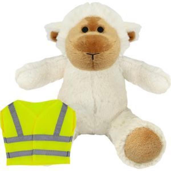 BLANK PLUSH SOFT TOY 20CM LUCY LAMB with Hi-vis Vest. Lucy Lamb Plush Toy Suitable for All Ages. with Machine Embroidered Eyes. Yellow with Silver Reflective Stripe, Sitting Height 20cm Approx. Minimum Quantity: 10.