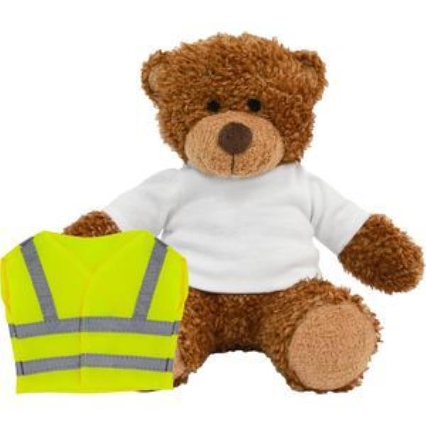 BLANK PLUSH SOFT TOY ANNE TEDDY BEAR HI-VIS VEST. Luxury Anne Plush Toy Bear, Suitable for All Ages, Machine Embroidered Facial Features, Yellow with Silver Reflective Stripe, Seated Height 18cm Approx, Brown Colour Fur, Minimum Quantity: 10.