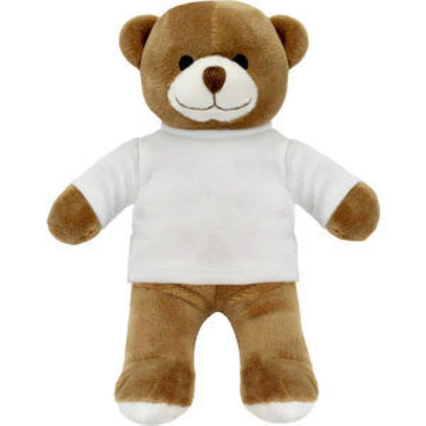 BLANK PLUSH SOFT TOY HENRY I TEDDY BEAR with White Tee Shirt. Henry I Plush Toy Bear - Dark Brown, Suitable for All Ages, Suitable for Sublimation & Tranfer Print, Machine Embroidered Facial Features, Seated Height 12cm Approx, Available in 3 Colours. Minimum Quantity: 10.