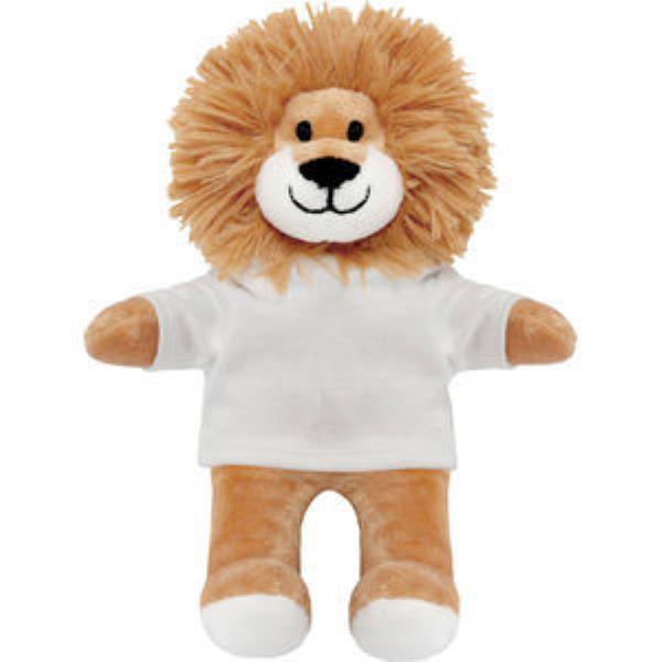BLANK PLUSH SOFT TOY LOUIS LION TEDDY with White Tee Shirt. Louis Plush Toy Lion - Light Brown with Darker Brown Mane, Suitable for Sublimation & Tranfer Print, No Tail, Suitable for All Ages, Machine Embroidered Facial Features, Seated Height 12cm Approx, Minimum Quantity: 10.