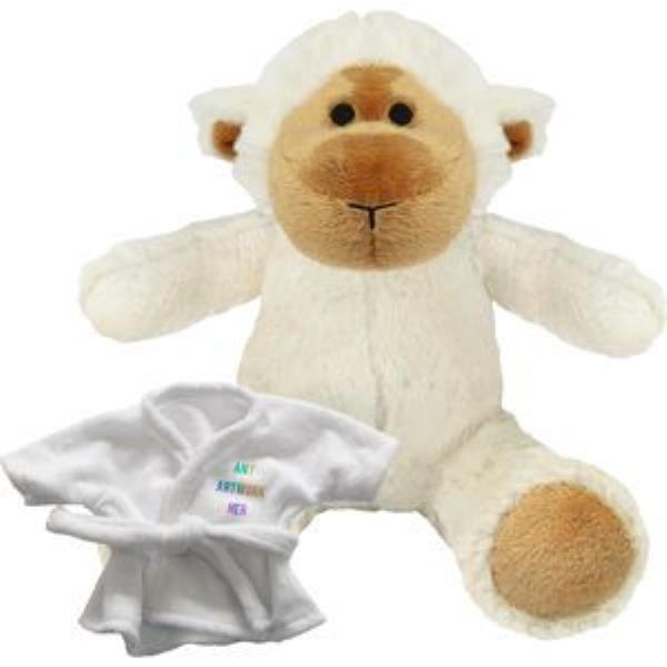 PRINTED PROMOTIONAL SOFT TOY 20CM LUCY LAMB with Dressing Gown. Branded to Your Specification & Personalised in Full Colour. Lucy Lamb Plush Toy Suitable for All Ages. with Machine Embroidered Eyes. White Robe with Tie Cord, Sitting Height 20cm Approx. Minimum Quantity: 10.