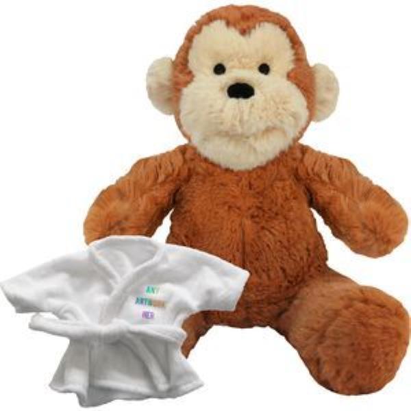 PRINTED PROMOTIONAL SOFT TOY 20CM MAX MONKEY with Dressing Gown. Branded to Your Specification & Personalised in Full Colour. Max the Monkey Plush Toy Suitable for All Ages. with Machine Embroidered Eyes. White Robe with Tie Cord, Sitting Height 20cm Approx. Minimum Quantity: 10.