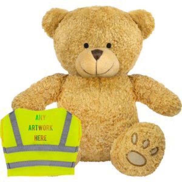 PRINTED PROMOTIONAL SOFT TOY EDWARD II TEDDY BEAR with Hi-vis Vest. Branded to Your Specification & Personalised in Full Colour. Suitable for All Ages, Machine Embroidered Paws & Facial Features, Yellow with Silver Reflective Stripe, Seated Height 22cm Approx, Golden Yellow Colour Fur - Available in Two Colours. Minimum Quantity: 10.